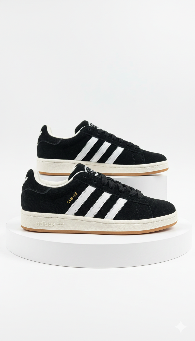 Branding: Metallic gold "CAMPUS" text on the side and Trefoil logos on the tongue and heel