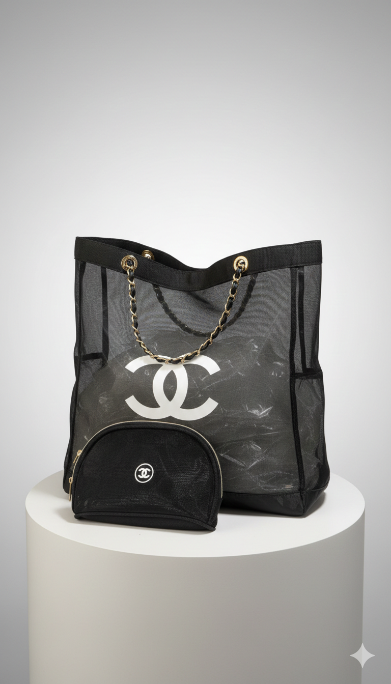 Product Title: Chanel Mesh Deauville Tote Bag with Matching Pouch.