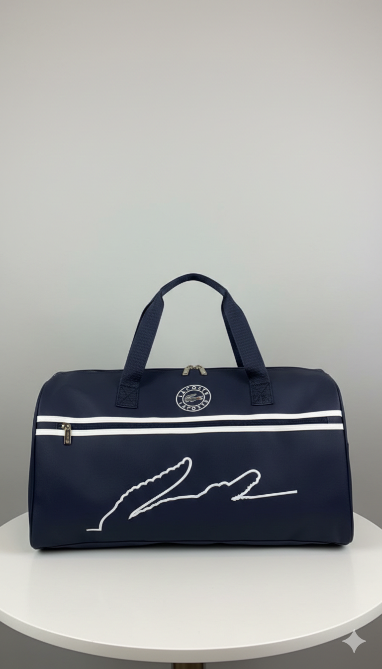 Design Features: Large embroidered white crocodile outline on the front and a circular Lacoste heritage logo. Features a zippered front pocket, dual top carry handles, and a spacious main compartment for travel or gym use.