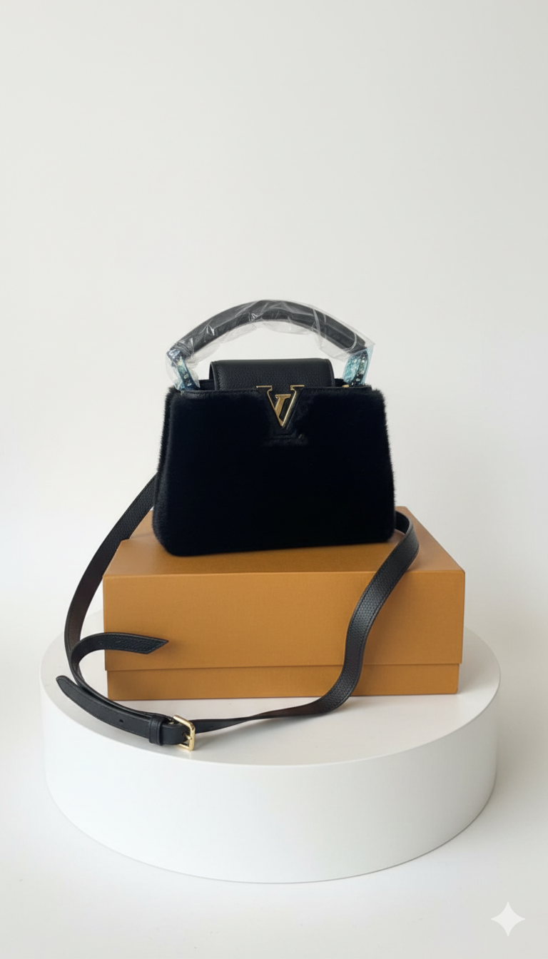 Product Title: Louis Vuitton Capucines Mini Black Mink Fur Handbag.