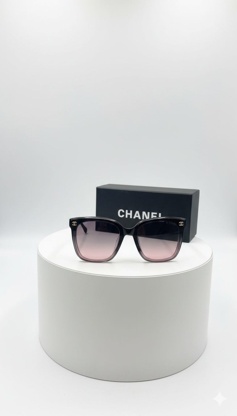 Design: Features a classic butterfly-shaped frame in black with gradient lenses that fade to a soft pink tint.