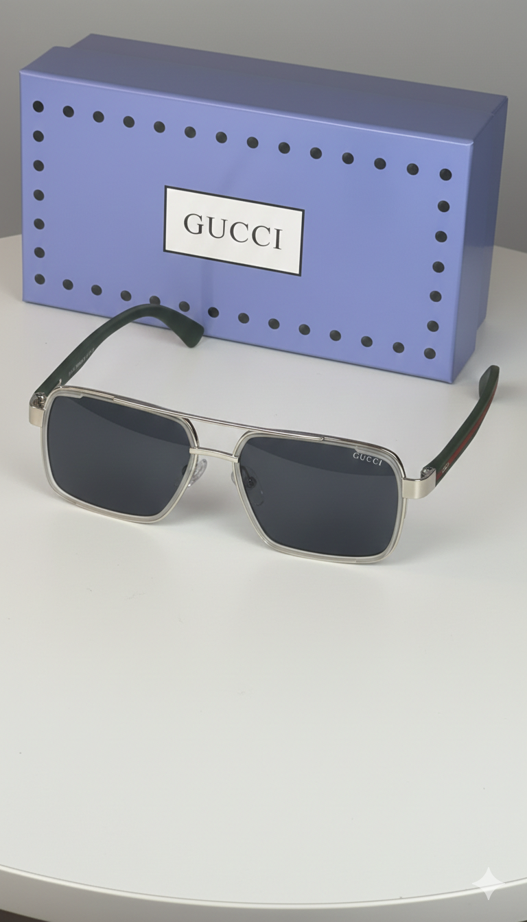 Signature Branding: The temples (arms) prominently feature the iconic Green and Red Web stripe, a hallmark of Gucci's equestrian-inspired heritage. The "GUCCI" logo is also etched on the corner of the right lens and subtly engraved on the temples.